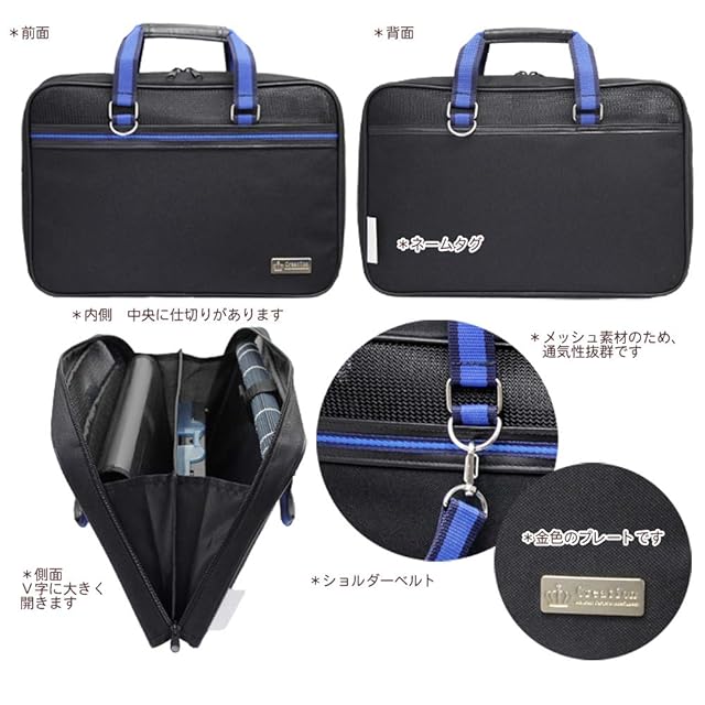 大きく開くので、書道用具の出し入れラクラク!通気性のあるメッシュ素材を使用しているので、カビを防いで清潔に使えます。