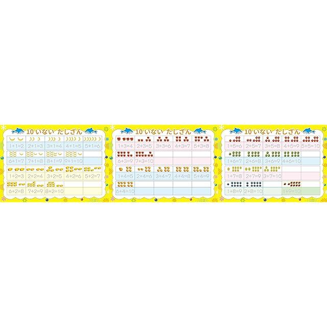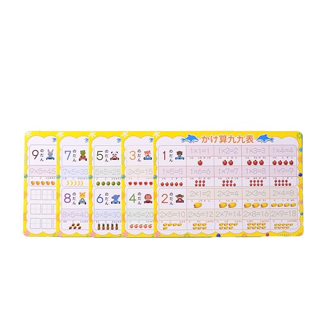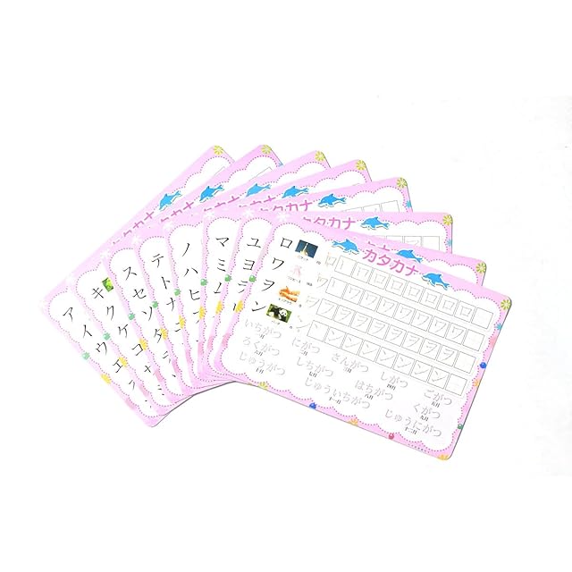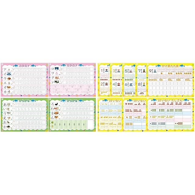 セット内容:ひらがな8枚、カタカナ8枚、かけ算5枚、たし算3枚、ペン1本、袋1枚です。