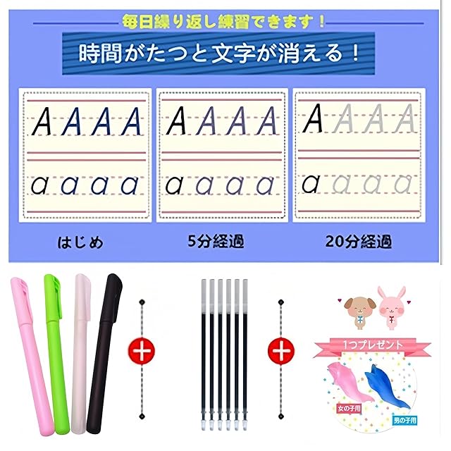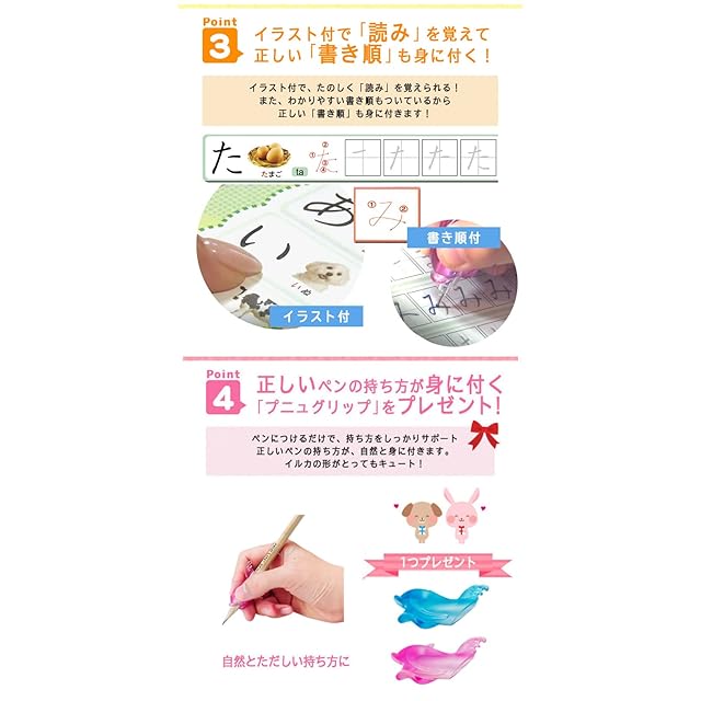 ※ワケアリ商品です。一部シートに汚れもしくはキッズがありますが。使用には問題がありません。返品不可です。 セット内容:ひらがなシート8枚、すうじ11枚 、バッグ1つです。 ●特徴: 筆跡は数分程度で消え、ボードを洗う手間や消した後のカスが散らかる心配はない。 ペンの正しい持ち方が自然に身に付くプニュグリッププレゼントいたします。 プニュグリップを使用すればペンの正しい持ち方が身につきます。 更に、整理・持ち運びできるファイルケースをセットプレゼントいたします。 わかりやすい書き順つきで、正しくきれいな文字・数字のお勉強用シートです。 何度でもくり返し練習ができ、楽しいので自ら進んで学習できます。 対象年齢 :3歳から ※この商品は実用新案です。登録第3212048号