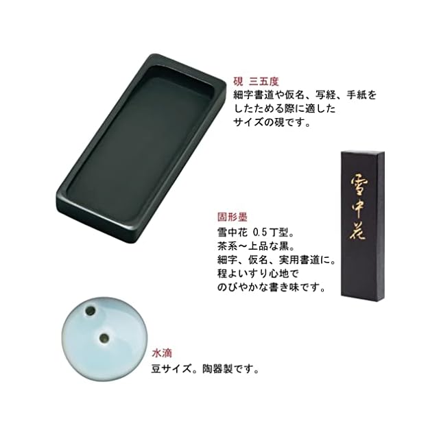 【セット内容】 細筆、硯(三五度)、固形墨「紅花墨 三ツ星(0.5丁型)」(古梅園製)、水滴(豆)、硯箱 越前塗