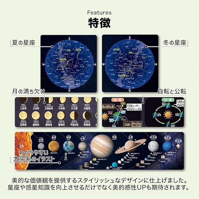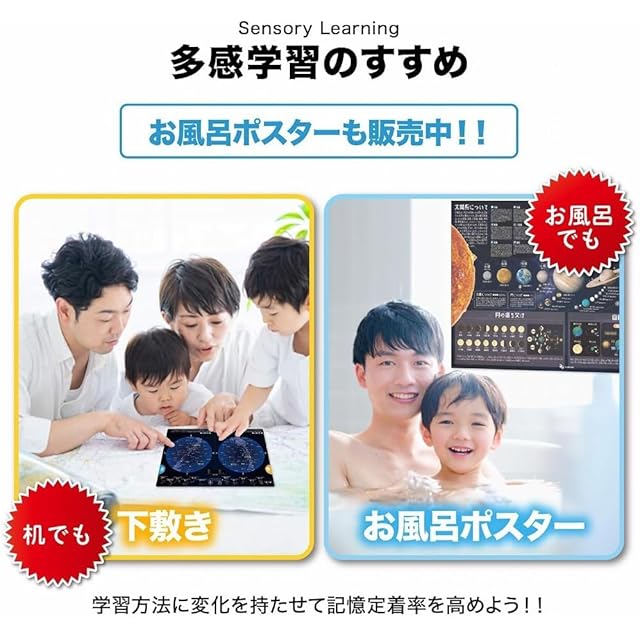 【裏面・太陽系の惑星】 太陽系の惑星(9天体)を図解表示しています。また、惑星などの天体の周囲を公転する衛星(例:木星のガニメデ、土星のタイタンなど)も収録しています。 惑星ごとに太陽からの距離・自転周期・公転周期・直径も表示。豆知識満載です。 また、月の満ち欠けをフェーズごとに写真&名称付きで表示。一目で覚えられますよ。 地球の自転・公転の図解や月の公転と日食・月食の仕組みまで掲載。理科の授業や中学受験対策にばっちりです。