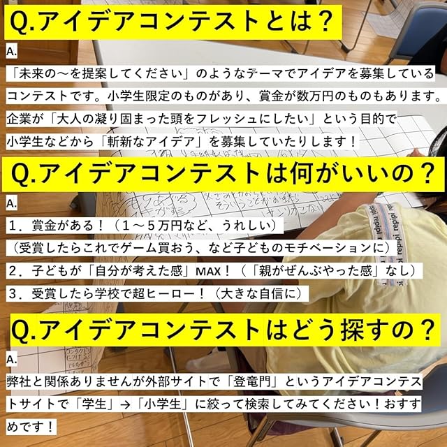 【賞金獲得のチャンス】 小学生限定のアイデアコンテストに挑戦すれば、数万円の賞金を獲得できるチャンスがあり、子どものモチベーションを高めます。