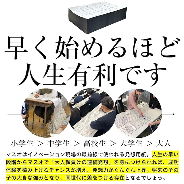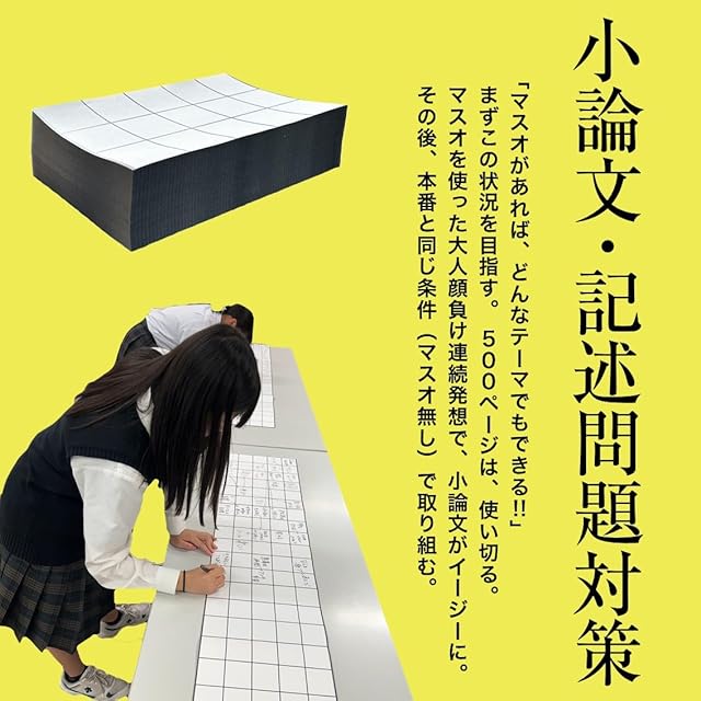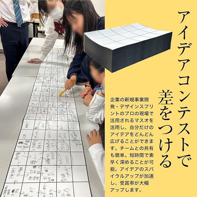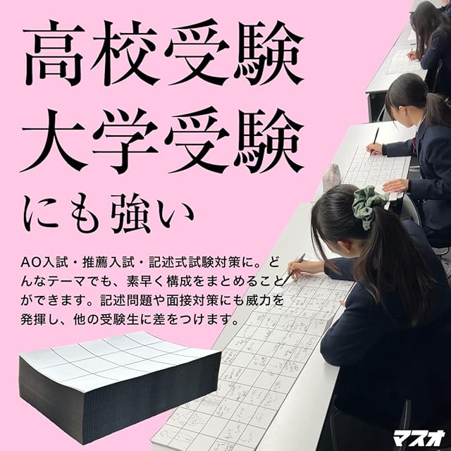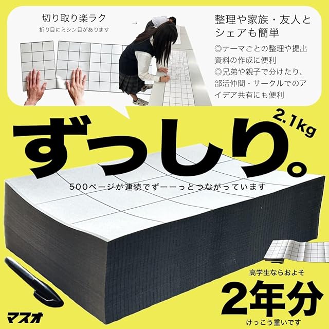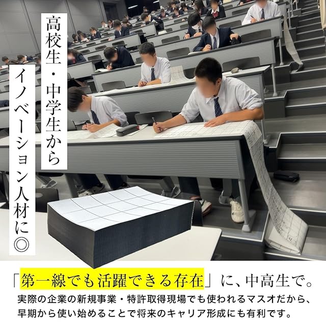 【高校生・中学生の探究・受験対策に最適】高校・中学の探究学習や記述問題、小論文・推薦入試対策に特化した新しい発想用紙です。テーマを決め、自由にアイデアを深掘りでき、論理的に構成をまとめる力が自然に身につきます。 【500ページの蛇腹型で大容量・使いやすい】ページをどんどん広げて自由に書ける蛇腹構造。ミシン目付きで1枚ずつ簡単に切り取れ、プレゼン資料やポートフォリオ作成にも最適。高校卒業まで長く使える500ページの大容量です。 【アイデアコンテスト・課題研究で】企画・新規事業開発・デザインスプリントのプロの現場で活用されるマスオを活用することで、自主学習・アイデア整理に最適で、確かな成果を得られます。