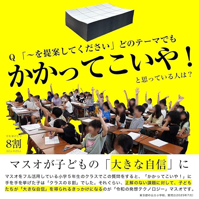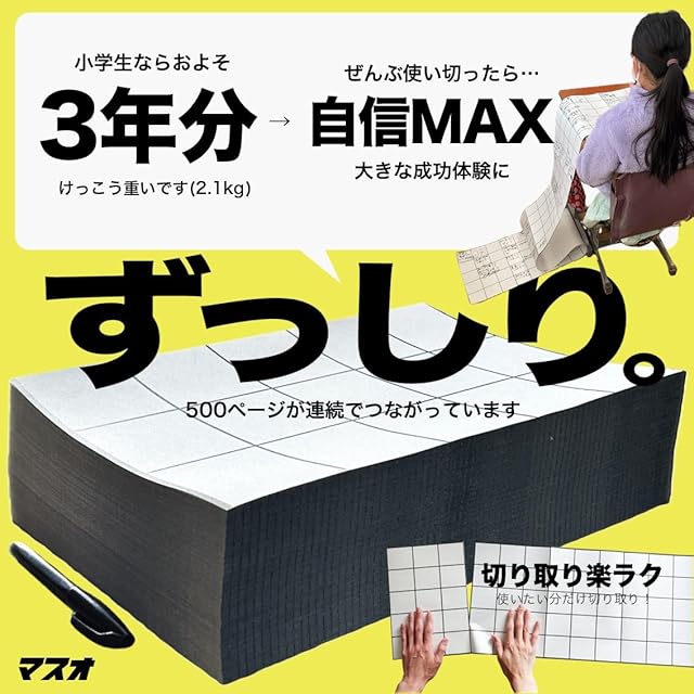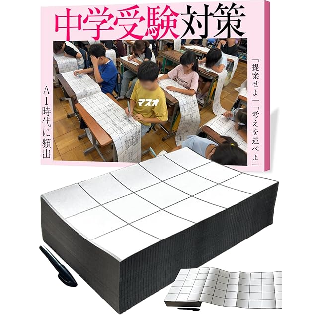 【「~を提案せよ」問題に強くなる!】 中学受験で急増中の課題解決型・自由記述問題。マスオは、その「何を書けば?」という不安を和らげ、アイデアを自然に引き出すための紙ツールです。 【塾ではカバーしきれない発想練習】 暗記や計算力だけでは対応しづらい“オリジナルの考え”をまとめるのに最適。大きなマスと蛇腹状の余白が、論理展開を視覚化し、自信を持って文章化できるようサポートします。 【短時間でも習慣化しやすい】 1日10分の「アイデアを書く時間」を設けるだけで、思考力や論述力が少しずつ育ちます。本番さながらの“まとめる力”を、普段の家庭学習で培えるのが大きなメリットです。 【面接・プレゼン対策にも】 「あなたならどうする?」と問われる面接に備えるためにも、頭の中を紙に可視化する習慣が重要。マスオは、答えがない問題に取り組む“考えるプロセス”を楽しく身に付けられます。 【A4蛇腹500ページの安心感】 大容量だから失敗を恐れず何度でもチャレンジでき、“もっと面白い案は?”と探究する余裕が生まれます。折り目にミシン目が付いているので整理・保管もしやすく、長期利用に適しています。
