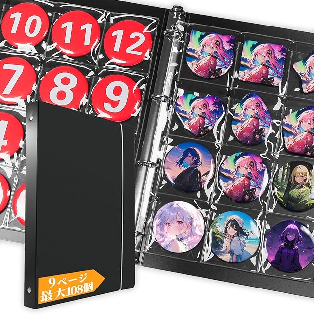 大容量 57mm 缶バッジ専用 収納ファイル 缶バッジ 収納 透明度 缶バッチカバー A4サイズ 108ポケット ファイル リフィル (ブラック)