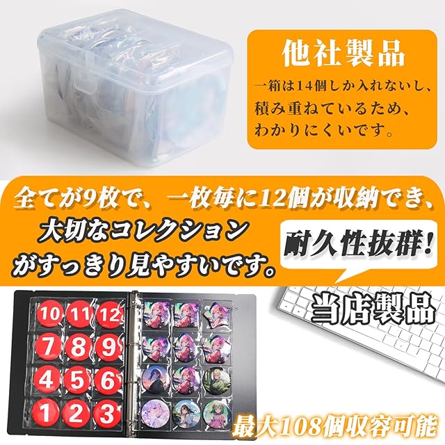【缶バッジ専用 収納 サイズ】:缶バッジ 収納、カードページ全体サイズ24.5×31×3㎝、単一グリッドサイズ7x6.3CM、 直径57㎜以内の缶バッジ、厚み9㎜以内。壊れにくくて、ホコリ防止。切なコレクションを保管するのに便利! (ご注意:新品ですので、素材はPP素材で、少し匂いがあるかもしれない、しばらく風を通せば匂いがきえます、どうか大目に见てください)
