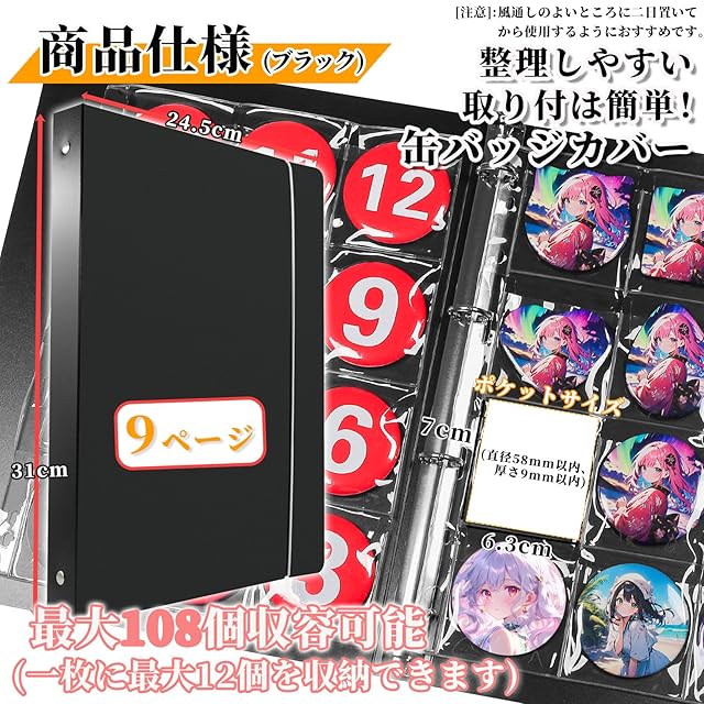 商品名:大容量 57mm 缶バッジ専用 収納ファイル 缶バッジ 収納 透明度 缶バッチカバー A4サイズ 108ポケット ファイル リフィル (ブラック)