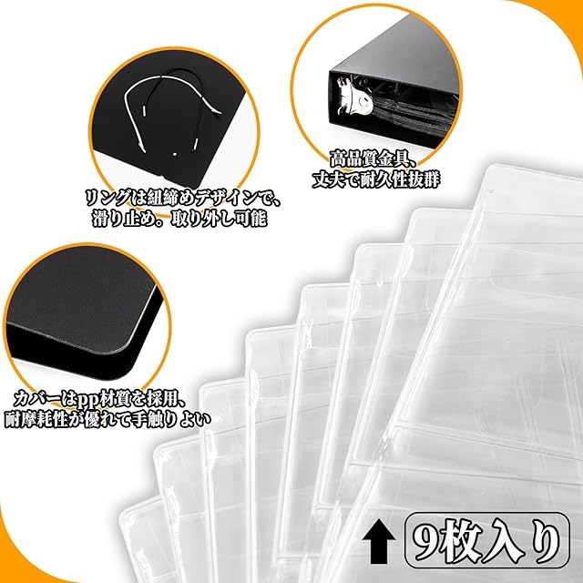 【出し入れがスムーズ】:ポケット仕様設計、収納物落下防止、異なるサイズを入れることが出来ます、整理整頓しやすいルーズリーフ。 リングは紐締めデザインで、滑り止め。大切なコレクションを「汚れ」「しわ」「折れ」「キズ」から守ります。長期保存したい方におすすめです。