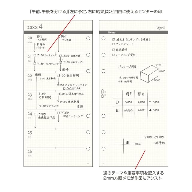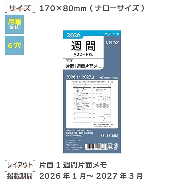 ノックス システム手帳 リフィル 2026年 ナロー ウィークリー 片面1週間片面メモ 52200226 (2026年1月始まり)