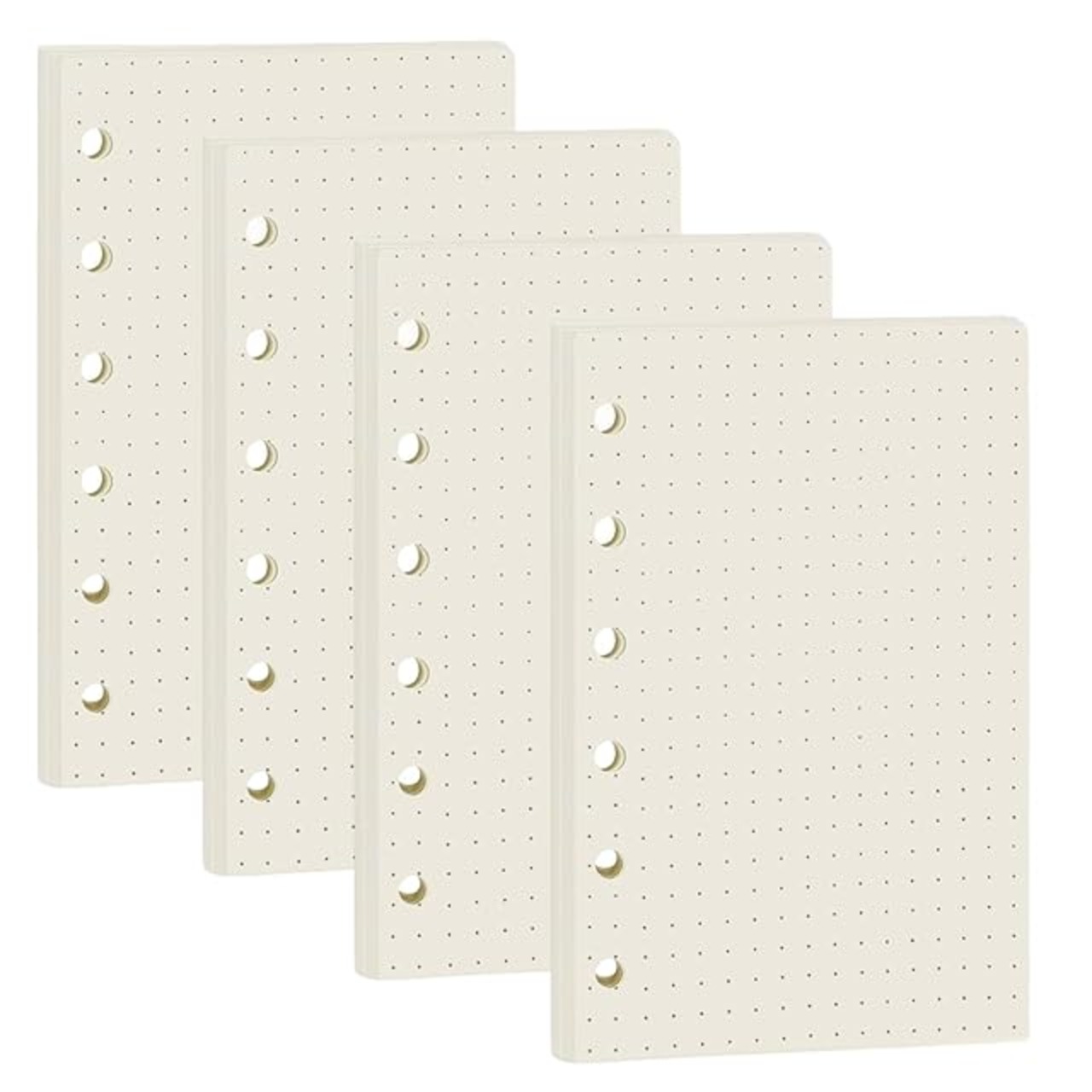 【商品詳細】:A7(W82×H123mm)のルーズリーフ(ドット紙)4枚セット、6穴タイプ、穴径:5mm、穴間隔:14mm。各書籍は45ページ、合計180ページです。持ち運びや簡単なメモ取りに最適です。