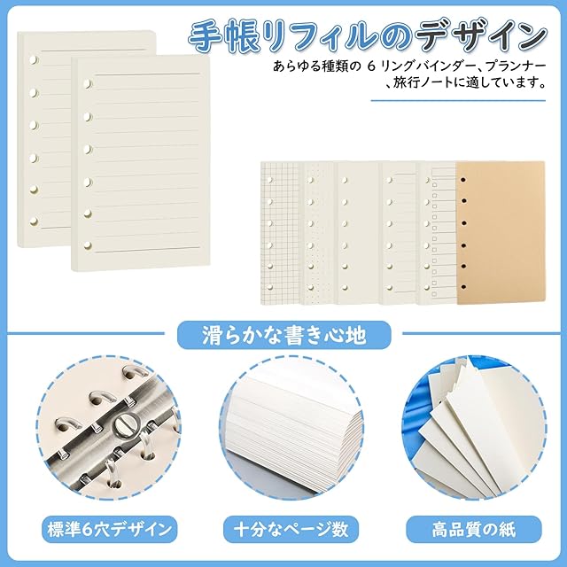 BLOOPIC システム手帳リフィルは、A7サイズの6穴システムノートや6穴ルーズリーフにぴったりフィットする、標準6穴デザインの便利なリフィルです。あらゆる種類の6穴ルーズリーフ、プランナー、トラベルノートに適しています。ノートの内側のページを交換するのに最適です。商用から個人利用まで幅広くご利用いただけます。高品質の紙は書き心地が滑らかで、メモやアイデアを書き留めるのに最適です。シンプルで実用的なデザインは日記管理をサポートし、さまざまなシナリオのニーズを満たし、記録効率を向上させます。