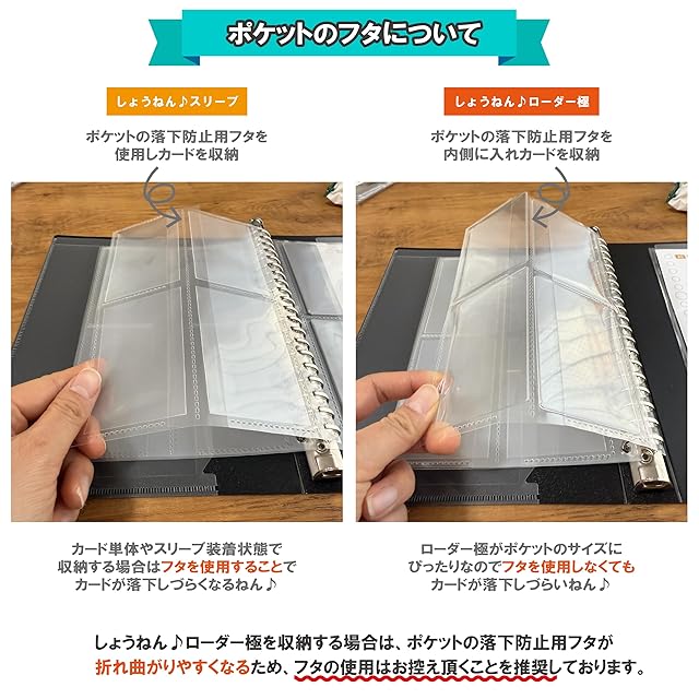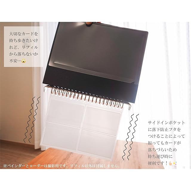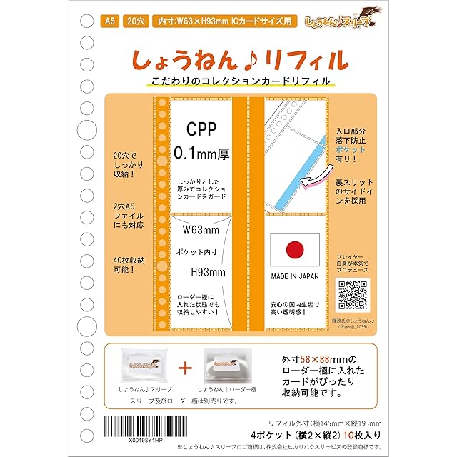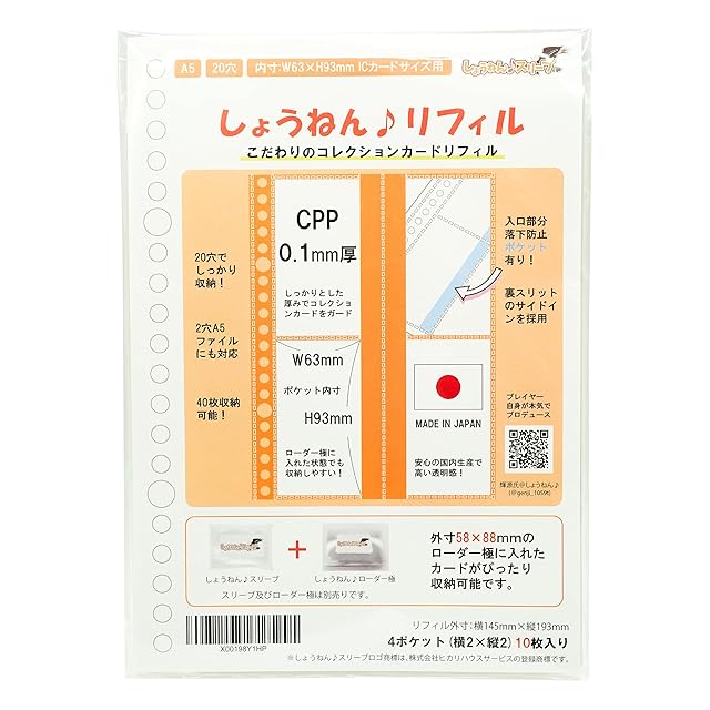 大人気極厚スリーブ『【ICカードサイズ対応】しょうねん♪スリーブ』対応のリフィルが登場! しょうねん♪ローダー極を装着したままファイリングが可能に! チェキやアーケードゲームカードの観賞及びファイリングに最適です。 落下防止ポケット付きで外出先のトレードでも安心です! ゲームセンターのアーケードゲーマーである輝源氏@しょうねん♪(@genji_1059t)が、 「高透明で落下防止ポケット付きのサイドインリフィルが欲しい!!」を本気でプロデュースしたこだわりの国内産特注A5 20穴リフィルになります! リフィル外寸は横145mm×縦193mmでA5サイズバインダー対応のものとなっており、持ち運びに便利なA5サイズで落下防止ポケットもあり、外出先のトレード等にも大活躍してくれます! しょうねん♪スリーブやしょうねん♪ローダー極を装着したまま大切なカード等を収納可能です。 素材はポリプロピレン(CPP)を使用しているため、オンデマンド印刷等のカードインクがリフィルに移ることはありません。 CPP(無延伸ポリプロピレン)の透明度はOPP(2軸延伸ポリプロピレン)よりも少し白っぽく濁りがありますが、耐熱性や引っ張り強度に優れています。 【しょうねん♪リフィルに対応するカード、スリーブ及びローダーについて】 横54mm×縦86mmサイズ(ISO/IEC 7810 ID-1)のアーケードゲームカード、ボードゲームカード、運転免許証、マイナンバーカード、チェキ用フィルム及び接触型ICカード等に対応しております。 スリーブは、別売りの【横55.5mm×縦87mm】CPP0.1mm厚ハードぴったりスリーブ【ICカードサイズ対応】しょうねん♪スリーブや【ダブルスリーブ用ICオーバーサイズ】CPP0.1mm厚ハードぴったりスリーブ【横57.5mm×縦88mm】しょうねん♪スリーブ のサイズに対応しております。 ローダーは、別売りの【ICカードサイズ対応】硬質PVCぴったりサイドローダー【内寸横56mm×縦87mm】しょうねん♪ローダー極のサイズにピッタリです。 なお、しょうねん♪ローダー極装着時はポケット自体がしょうねん♪ローダー極にピッタリサイズであるため、落下防止ポケットのフタを使用せず収納することをおすすめしております。 ※しょうねん♪リフィルはリフィルのみの販売です。バインダーファイルは、お好きな市販のA5サイズ20穴の商品をお買い求めください。