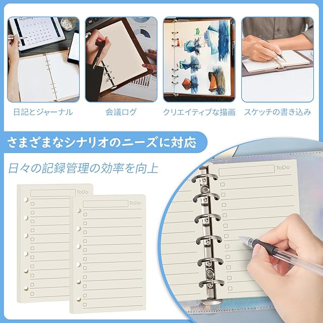 【商品詳細】:A7(W82×H123mm)のルーズリーフ(To Do リスト)4枚セット、6穴タイプ、穴径:5mm、穴間隔:14mm。各書籍は45ページ、合計180ページです。持ち運びや簡単なメモ取りに最適です。