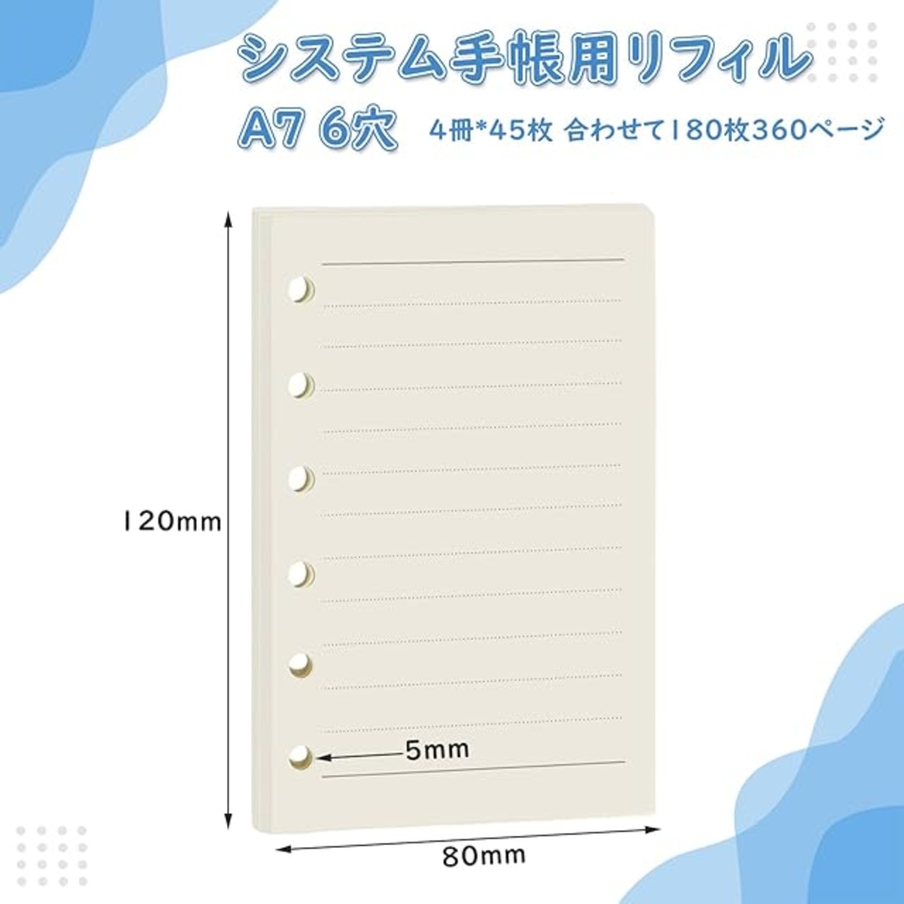 【商品詳細】:A7(W82×H123mm)のルーズリーフ(ライン紙)4枚セット、6穴タイプ、穴径:5mm、穴間隔:14mm。各書籍は45ページ、合計180ページです。持ち運びや簡単なメモ取りに最適です。