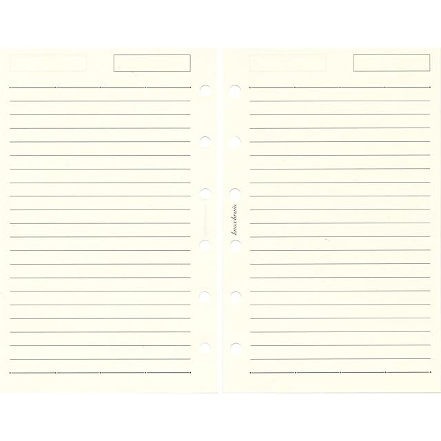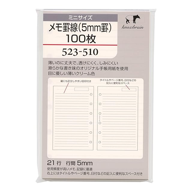 ノックスブレインのオリジナル手帳用紙。「薄いのに丈夫で、透けにくく、しみにくい」新開発した紙を使用。紙色は高級感のある薄いクリーム色で、紙の素材密度を高めることで、書き味がより滑らかになりました。。。使用頻度が高いメモ、記録に最適。右上にはタイトルやページ番号、日付などの記入に便利なスペース付き。。21行、行間5mm。100枚入り。。サイズ:縦=128mm 横=80mm 。用紙色:クリーム色。