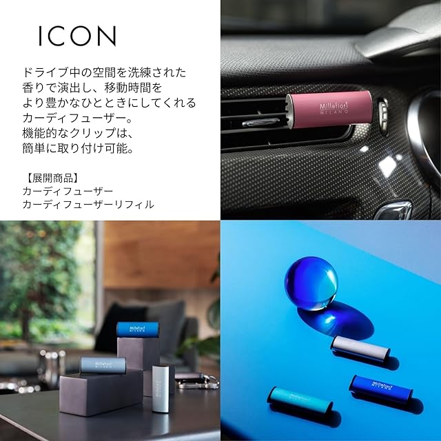 【ICONシリーズ】ドライブ中の空間を洗練された香りで演出し、移動時間をおり豊かなひとときにしてくれるカーディフューザー。機能的なクリップは、簡単に取り付け可能。