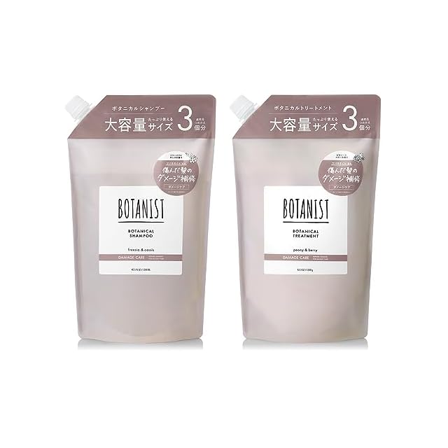 「髪を自然で満たしきる」BOTANISTのダメージケアシャンプー&トリートメントの詰替大容量セットです。 【シャンプー】 なめらかな、ツヤのある髪に洗い上げます。 優しく可憐なフリージアとカシスの香りで、洗髪時から心地よい香りに包まれます。 自然由来指数 84%(水を含む ISO16128準拠) シリコンフリー・パラベンフリー・合成着色料フリー・サルフェート(硫酸系界面活性剤)フリー処方 【トリートメント】 なめらかな、ツヤのある髪に仕上げます。 柔らかく艶やかなピオニーとベリーの香りが髪に残り、一日中香りを楽しめます。 自然由来指数 91%(水を含む ISO16128準拠) パラベンフリー・合成着色料フリー処方 【両製品共通の特長】 ①「濃密ボタニカル美容液」配合で3つのケアを実現 ・地肌ケア:2種のシラカバウォーター、グリチルリチン酸2K(保湿成分) ・保湿ケア:サトウキビ糖蜜、ナノ化コメセラミド(保湿成分) ・ダメージケア:ナノ化マカダミアナッツオイル、ボタニカルマイクロプロテイン(毛髪補修成分) ②ダメージケアに特化した植物成分「ツバキ種子油(保湿成分)」配合 ③環境に配慮した詰替パウチ ・再生プラスチック使用で石油由来原料を削減 ・本体容器よりも廃棄プラスチックを約87%削減 シャンプーとトリートメントを一緒に使うことで、ダメージを受けた髪を内側からケアしながら、なめらかで艶のある髪へと導きます。香りの相乗効果で、贅沢なバスタイムを演出します。