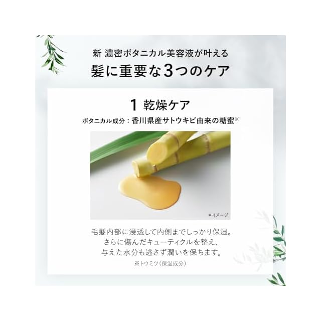 ✨【主要成分】濃密ボタニカル美容液(シラカバウォーター、サトウキビ糖蜜、コメセラミド、マカダミアナッツオイル)とツバキ種子油配合でダメージヘアを効果的にケア