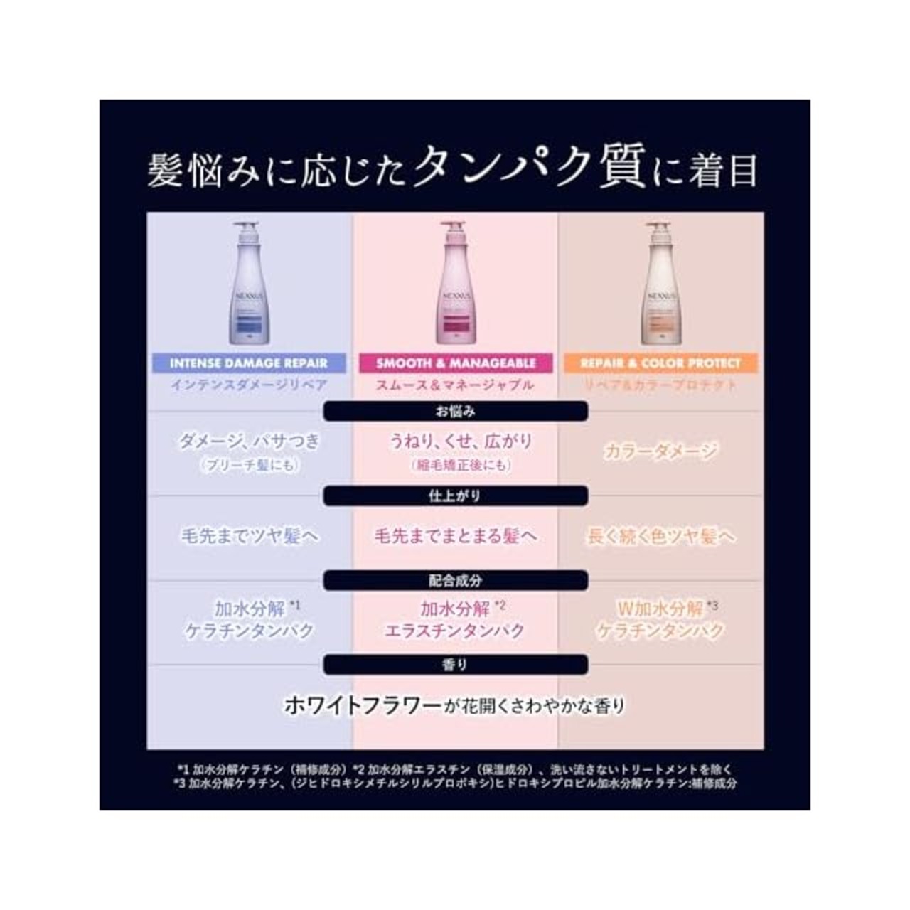 髪悩み別のタンパク質に着目。加水分解エラスチンタンパク*1、グリーンキャビア抽出成分*2 配合。*1 加水分解エラスチン(保湿成分)*2 クビレヅタエキス(保湿成分)
