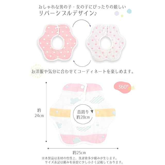 【360 スタイ】元気な赤ちゃんの動きによってスタイはクルクル回ってしまいます。360°の円形スタイならどの方向からでもしっかり吸収してくれてストレスフリーです!