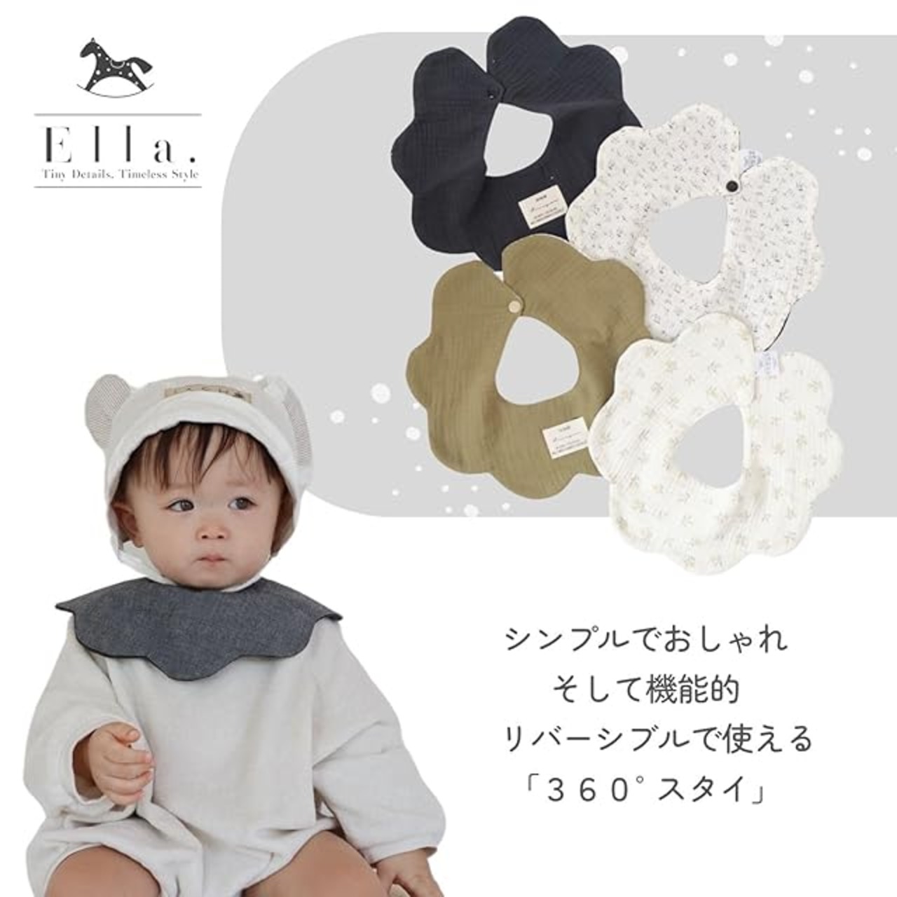 商品名:[Ella.] 360° スタイ 2枚セット リバーシブル シンプル おしゃれ ベビー 赤ちゃん コットン 綿 かわいい くるくる 360 よだれかけ ベビービブ 男の子 女の子 無地 (Bセット)