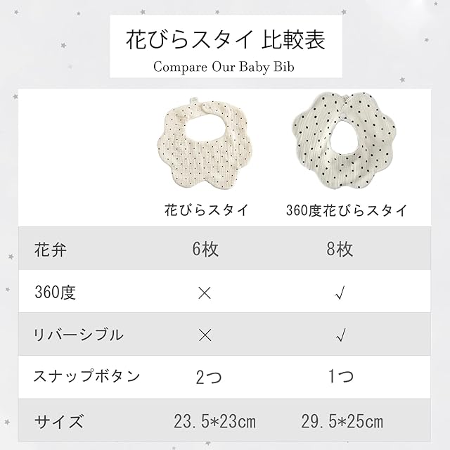 <p>ご覧頂きありがとうございます。</p><p>品質へのこだわり:ベビー衣料専門工場で縫製、生産、日本の検査機関で生地の検査をした安心の商品です。</p><p>お花が咲いたような形がキュートなベビースタイが登場</p><p>「パパもママも赤ちゃんも楽しく食べる事」うれしいポイント</p><p>吸水性の良さからも、綿100%生地を採用。ガーゼを使用し、ふんわりとした厚みがあります。</p><p>撥水加工されている</p><p>ベビーの首回りを360度カバーしてくれるのでスタイが背中に回ることがなく、つねによだれをキャッチしてくれるのがうれしいポイント。</p><p>両面どちらをお使いいただいてもかわいいです。リバーシブルのアイテムが1枚で2種類のデザインが楽しめるからお得感も。</p><p>洗濯機で丸洗いが可能</p><p>出産準備や保育園準備にぜひ。姉妹・兄弟・お友達とのお揃いコーデがオススメ。</p><p>