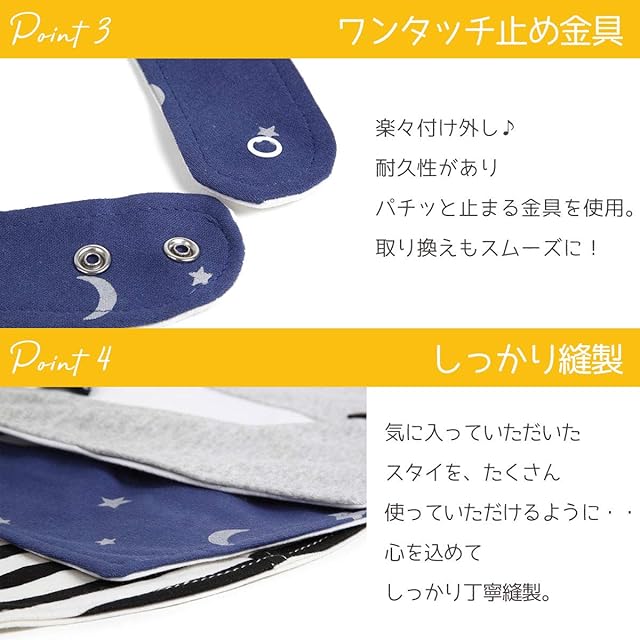 取り外しが簡単なスナップボタンで留めるタイプです。お子様の首周りに合わせて調整できます。