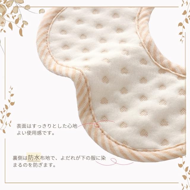 【防水性と通気性は抜群】表面は吸水性に優れた綿素材を使用しよだれや食べこぼしによる水分を吸収します。裏側は防水布地で、よだれが下の服に染まるのを防ぎます。