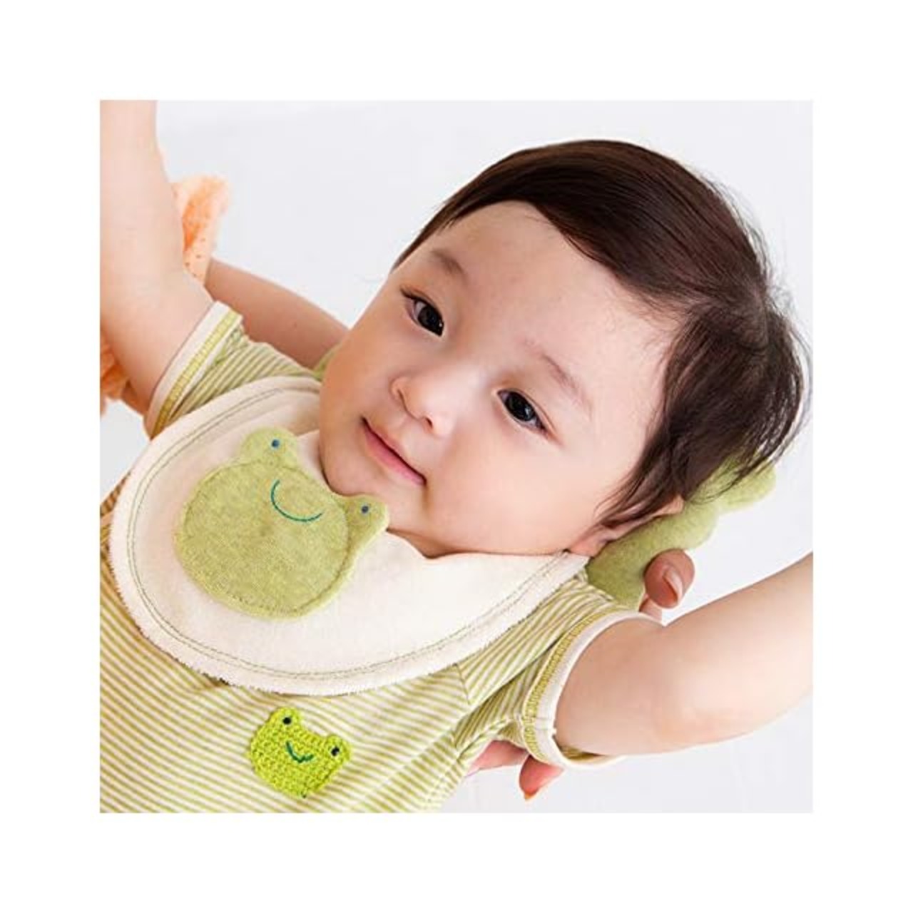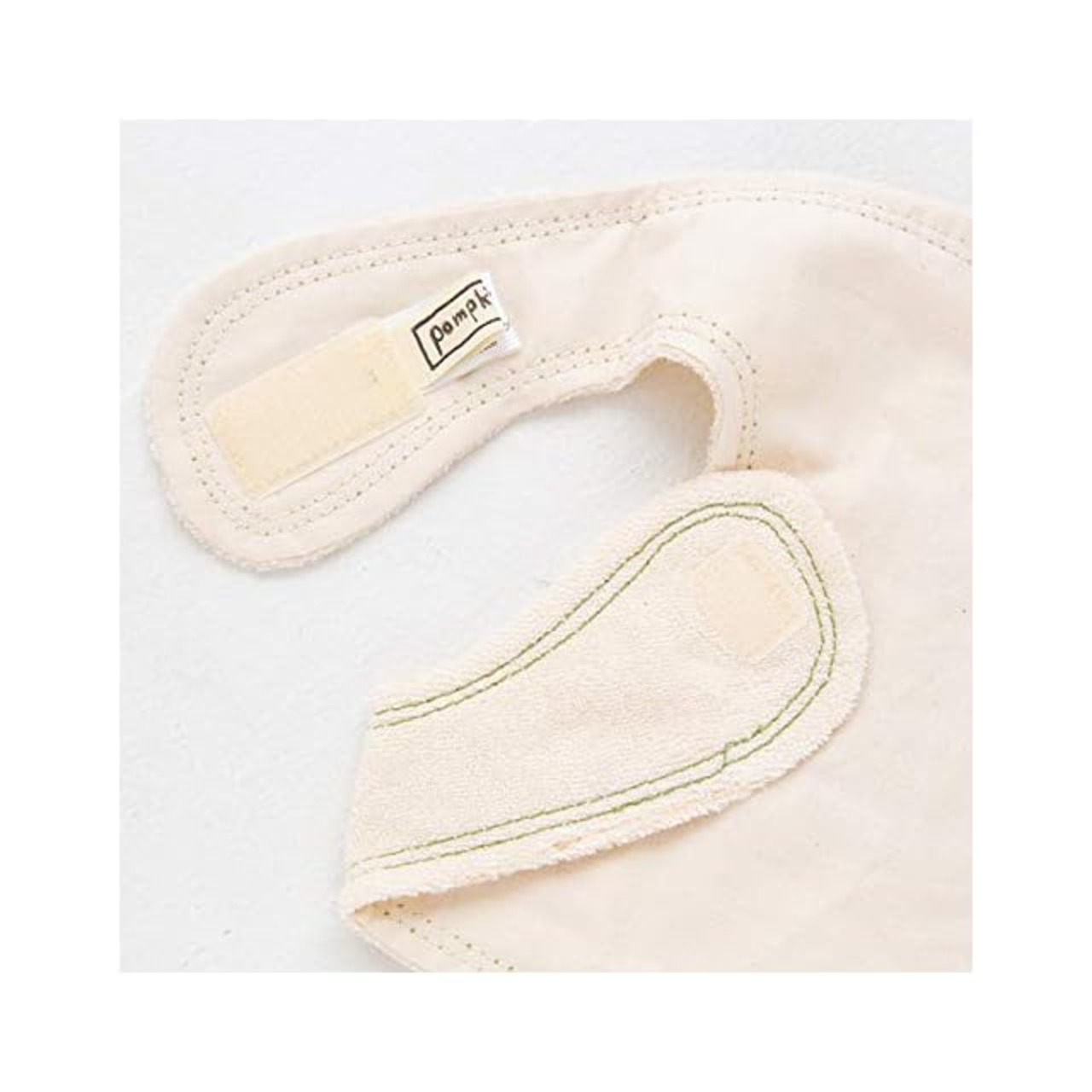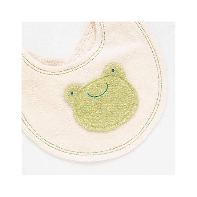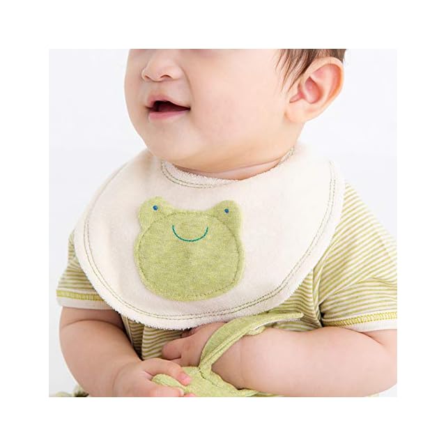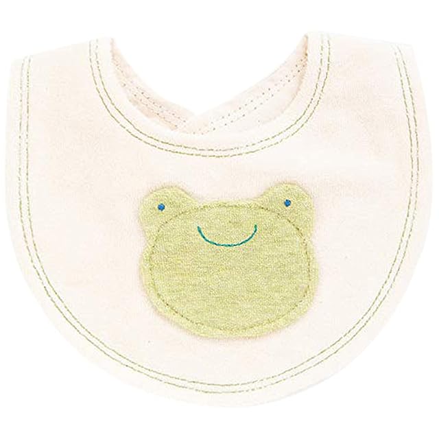 【pompkins BABY オーガニックコットン100%シリーズ】【かえるコレクション】半立体のかえるモチーフが可愛いパイル素材のミニスタイです。 うしろのマジックテープで首まわりの調節ができます。サイズ(約):縦16cm×横18cm