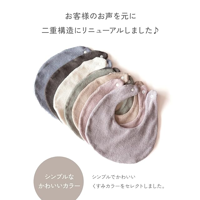 日本の肌着屋さんが丁寧に作った、赤ちゃんの肌に優しいコットン100%のふかふかパイル生地を使用したよだれかけです。繊細な技術と品質へのこだわりが詰まった設計で、敏感肌のお子さまにも安心してお使いいただけます。男女問わず使いやすいおしゃれなくすみカラーで、実用性とデザイン性を兼ね備えたアイテムです。