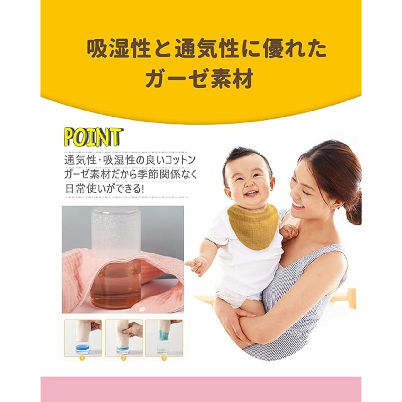 【ベビー ビブの特徴】抗菌性・耐久性・実用性・通気性がよい。よだれや食べ物の屑と赤ちゃんのお肌と接触するのを遮断できるので、細菌が繁殖することを防止する効果は優れています。赤ちゃんの健康をよく守れます。通気性も優れすぐに乾くのでいつでも爽やかな肌触りを実現。通気性・吸湿性の良いコットンガーゼ素材だから季節関係なく日常使いができる!