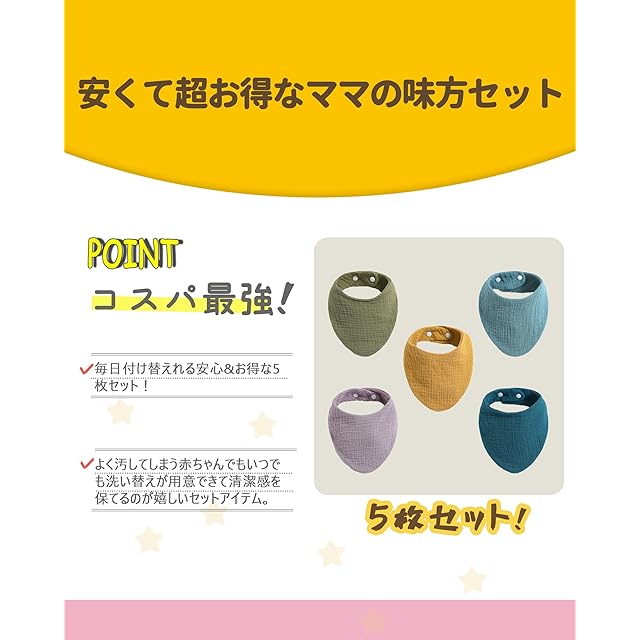 【製品仕様】5枚セット、一枚一枚手作りです。0-3歳の赤ちゃんにぴったりのスタイです、お子様の成長に応じて調整することができます。5つのかわいい組み合わせがあります,お母さんたちは気の向くままに組み合わせられる。
