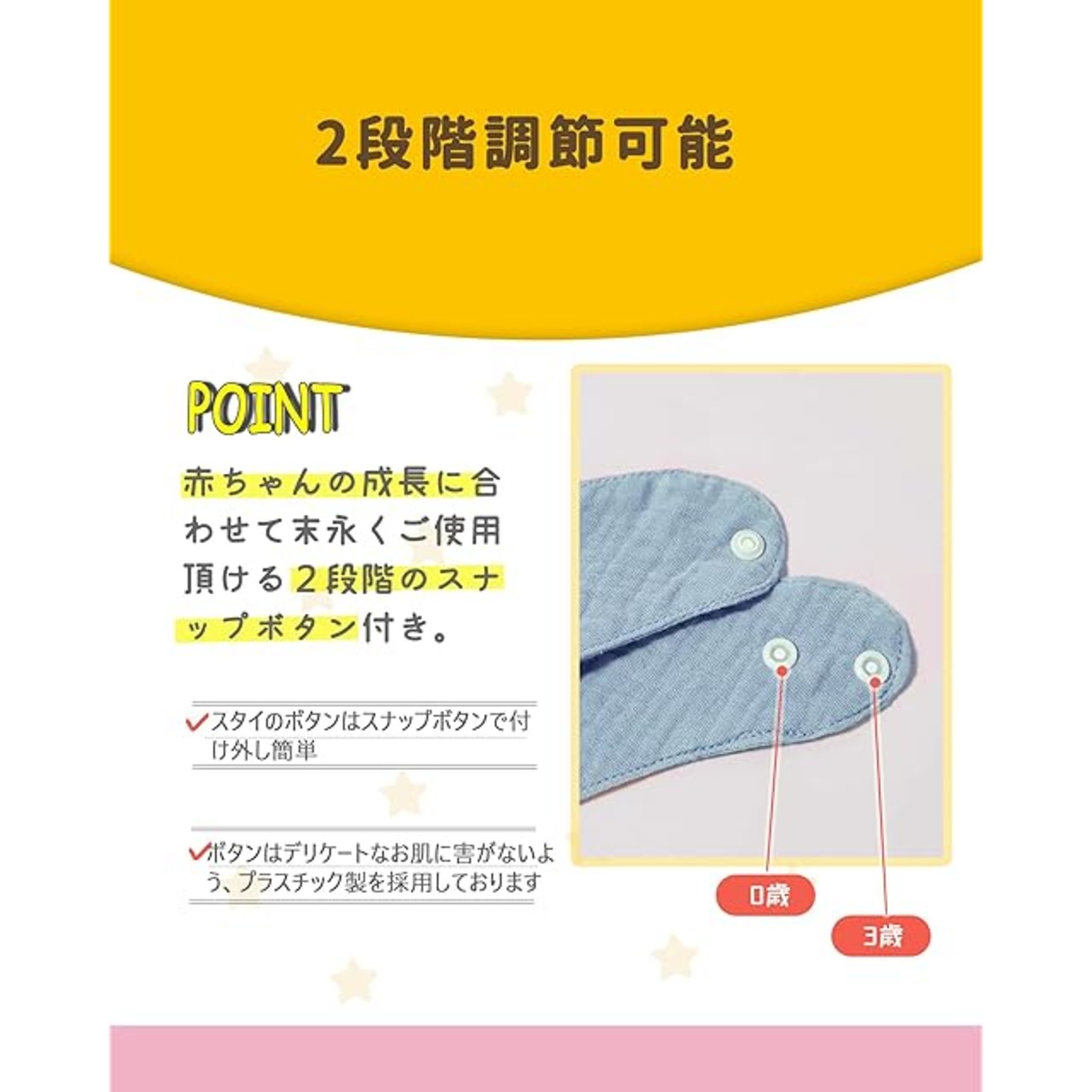【サイズ調節可能】調整できる二つのボタンがあるというデザインで、赤ちゃんの首のサイズにより、自由に調整つできる。赤ちゃんはどんなに動いても脱ぎにくい。(*注意:生地が柔らかくて薄いです。ボタンがきついので、ボタンを外す際は布をつかんで無理に引き裂かないで、ボタンの部位をつかんで外してください。)