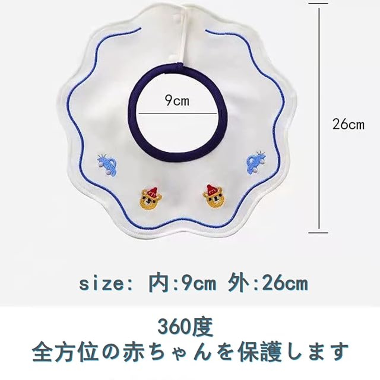 【サイズ】26cm×26cm、首の幅:9cm、0-3歳の赤ちゃんにぴったりのスタイです。