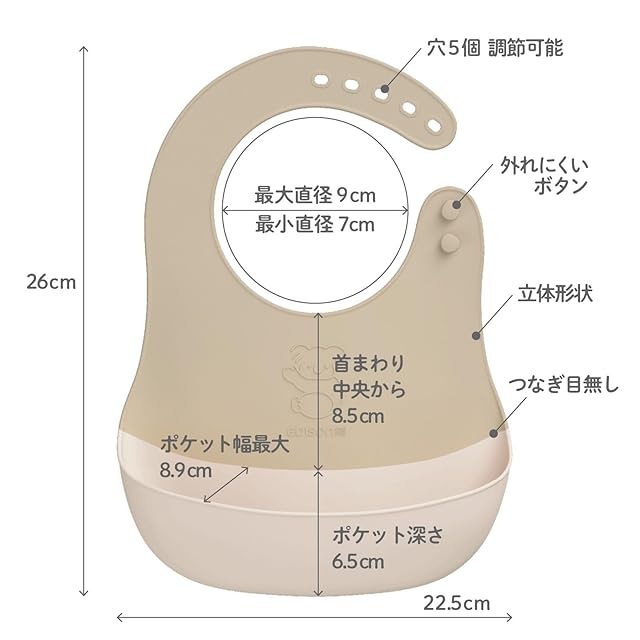 サイズ:本体:W225×H260mm/93g、ポケット:幅最大89mm、深さ65mm、首回り:最大直径90mm、最小直径70mm