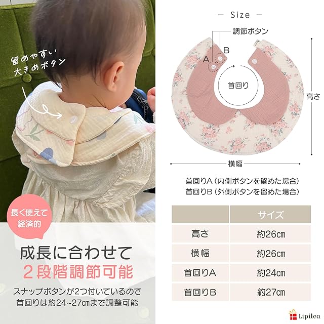 ⭐【サイズは2段階に調節OK】首回りは2つのスナップボタンで24cm・27cmの2段階調節が可能。赤ちゃんの成長に合わせて長く使えます。買い替え頻度が少なくて済むので経済的なところもうれしいポイント!ボタンは少し大きめで留めやすさも抜群です。スナップボタンは着脱が簡単なので、赤ちゃんもママ・パパもストレスフリーです◎