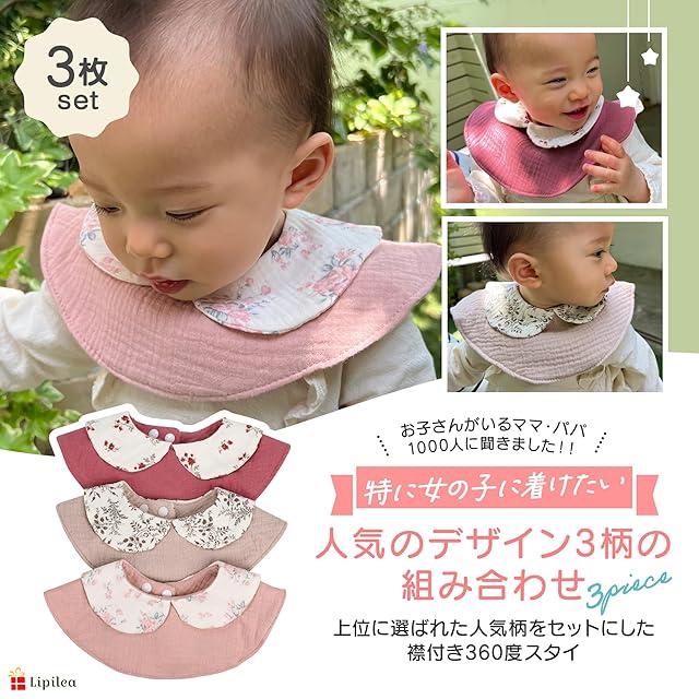 ⭐【商品詳細】〇サイズ:横幅/約26cm、高さ/約26cm、首回りA/24cm、首回りB/27cm 〇素材:綿100%(6重ガーゼ) 〇組合せ:6パターン(A、B、C、D、E、F) 〇セット内容:よだれかけ3枚 〇ブランド:Lipilea(リピレア)