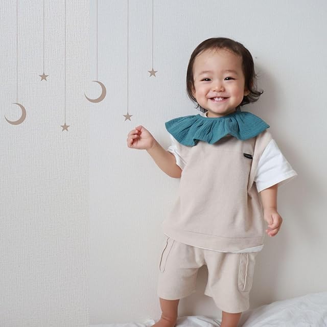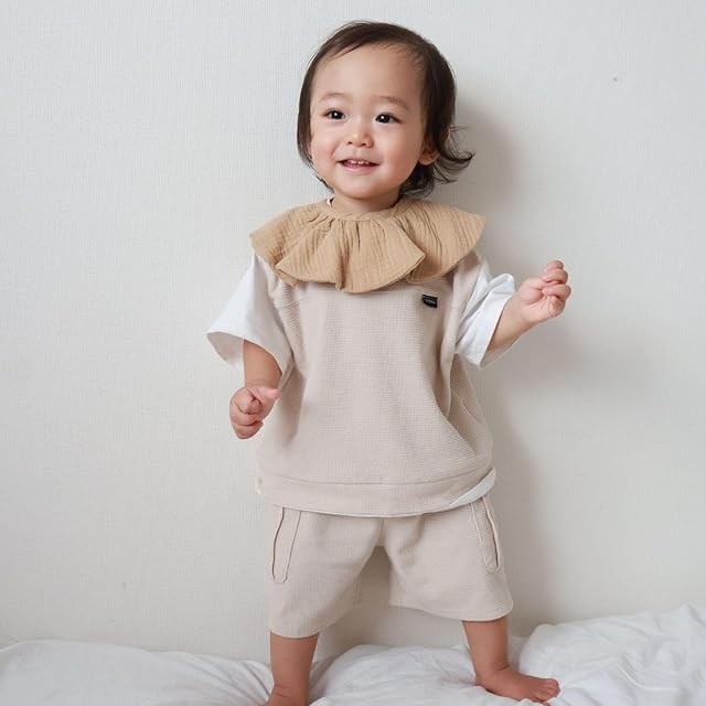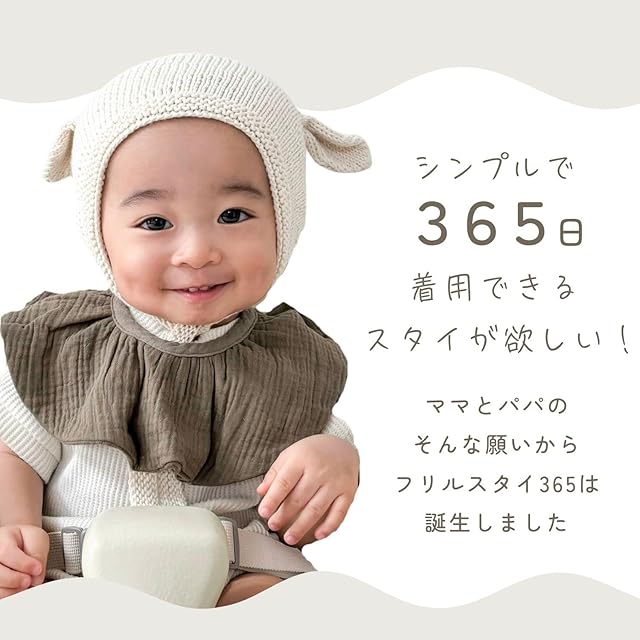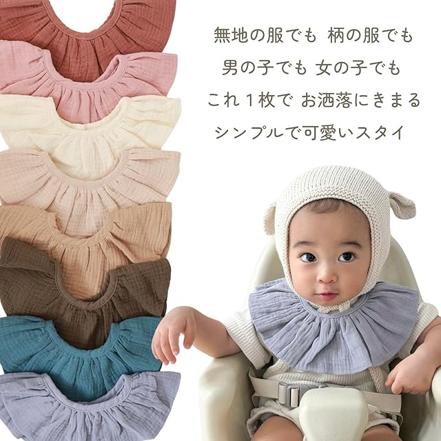 リバーシブルで使えるフリルスタイシンプルなコットン生地に可愛らしいニュアンスカラーのスタイです。同生地・同色仕上げなのでリバーシブルで使用して頂けます。男女問わずお使い頂ける落ち着いたフリルデザインは、ハイハイの時期にもあんよが始まったよちよち歩きの時期にも、どんな服にもマッチしてオシャレに見せてくれまます♪