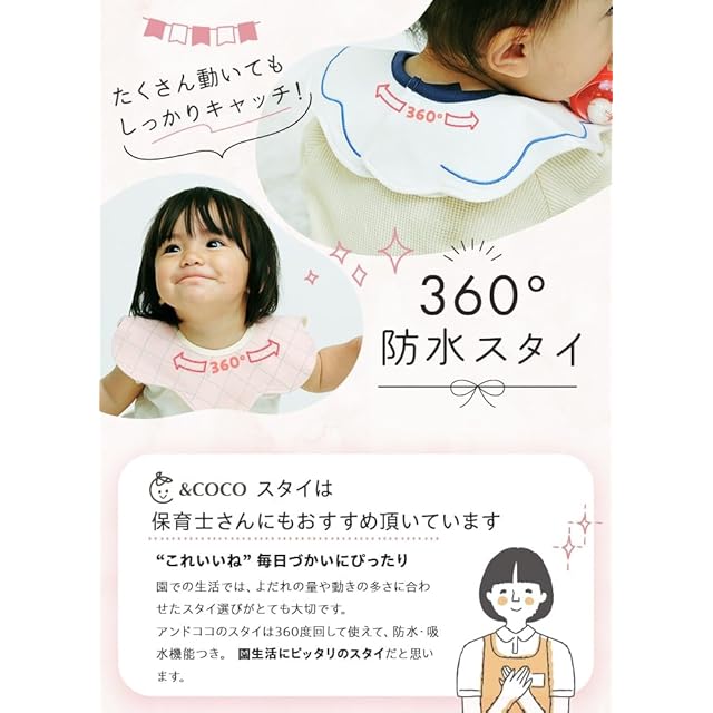 【 1. 360度使える!くるくるスタイ 】 よだれが多い赤ちゃんのスタイ、一日に何度も交換するのは大変ですよね。アンドココのスタイは 360度 使える円形デザイン(よだれカバー)。汚れたら回すだけで、いつでも清潔な面でお顔を拭けます。赤ちゃん が動いても全方向でよだれをキャッチ!交換の手間が減り、ママパパも嬉しい。新生児 からよだれが増える時期(1歳、2歳頃)まで長くご愛用いただけます。