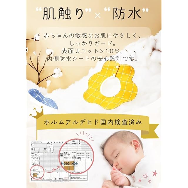 【素材】表面・裏面:綿素材 中間層:TPU防水素材 【推奨年齢:】0か月~5歳まで 【バリエーション】Aタイプ~Iタイプ (各4枚セット)(H・Iタイプはリバーシブル仕様) 【お手入れ方法】 洗濯機で洗濯可能です。(ネット推奨)