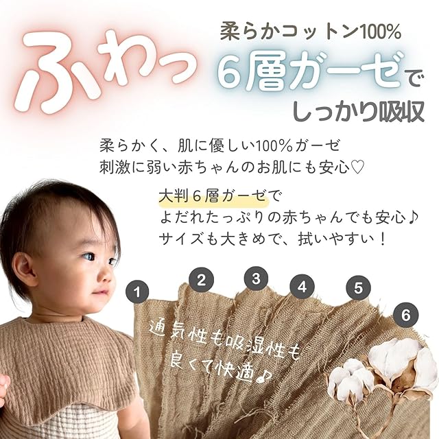 大判6層ガーゼ柔らかい6層ガーゼが赤ちゃんのたっぷりよだれをしっかりキャッチして吸収。23*25cmの大判サイズだから肩までカバーで安心です。大きなサイズのスタイなので口元のよだれを拭き取るのにも便利です。通気性があるガーゼ素材なので通年快適にご使用いただけます。