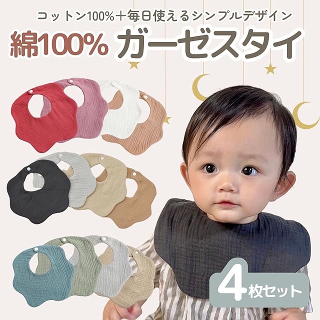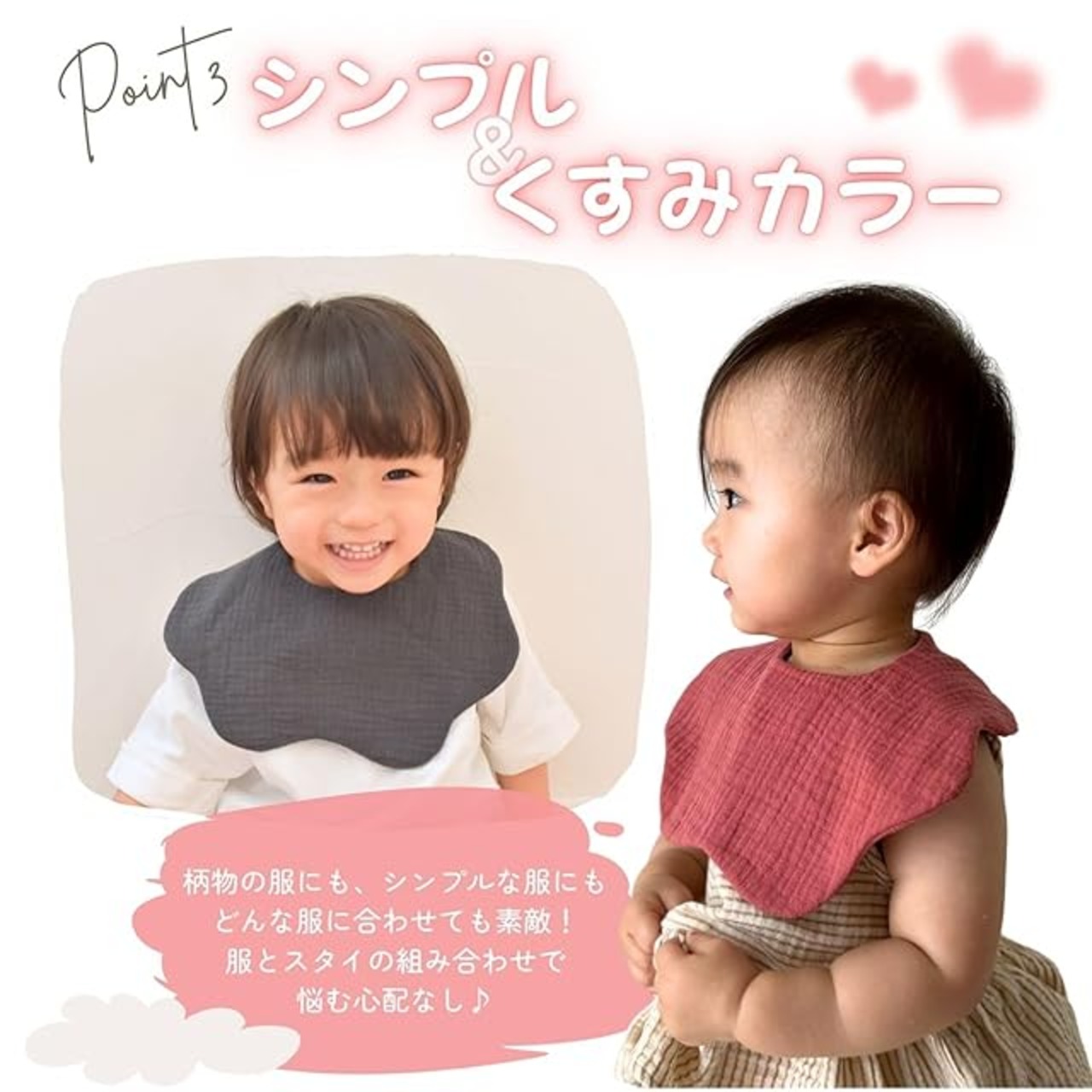 無地でシンプル、くすみカラーのスタイセットが登場! 赤ちゃんの柔らかな肌に優しい100%ガーゼ素材を使用。 6層ガーゼでしっかりと吸収するので、よだれがたくさん出る赤ちゃんでも安心してご使用いただけます。ガーゼ生地は通気性と吸湿性が良く、赤ちゃんも快適に過ごすことができます。またサイズも大きめで拭くのも簡単!! 無地のシンプルでくすみカラーのデザインだからどんな服にも合わせやすく、服とスタイの組み合わせで迷う心配なし。 4枚セットでコスパ抜群のおしゃれなスタイです♪