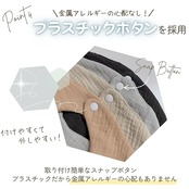 プラスチックボタン金属アレルギーの心配がないプラスチックスナップボタンを採用、お肌の敏感な赤ちゃんにも安心してお使いいただけます。パチッと止める・外すだけなので着脱も簡単です。