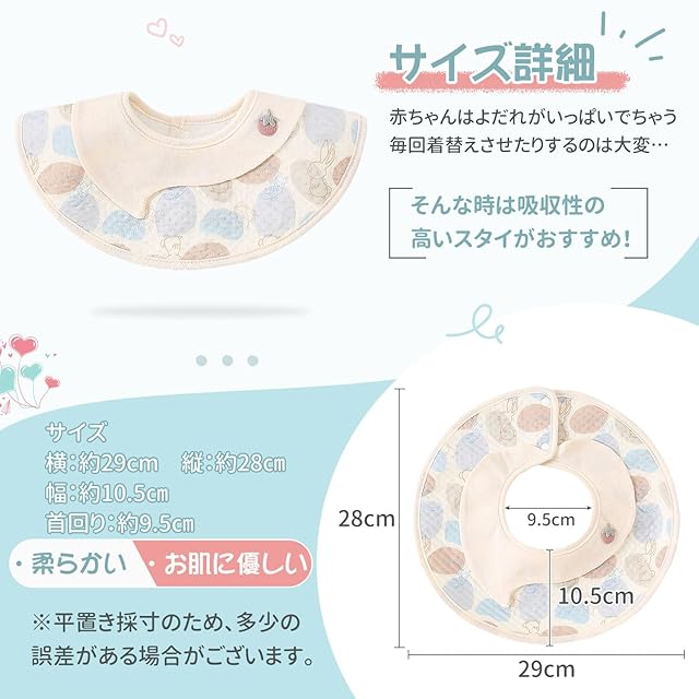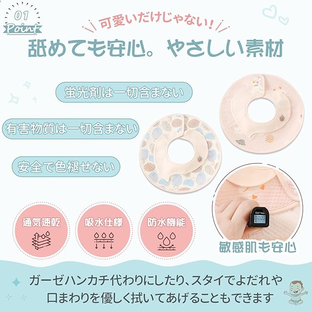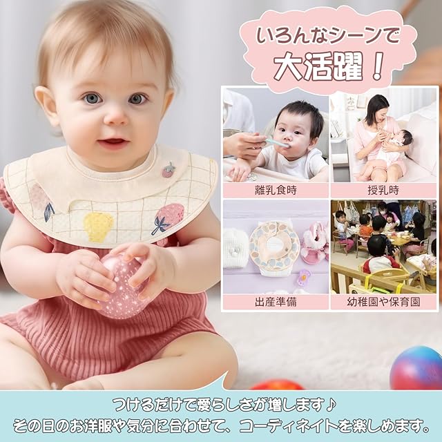 【360度回転可能】360度使用できる花びら型スタイは、食べこぼしなどで濡れた面を回転させれば、取り替えずに再度使用できます!吸水性、通気性あり360度回転可能なので、動き回ってもズレる心配がありません。全方位でよだれをキャッチできるので、お洋服などを汚しづらくいつでも清潔に。