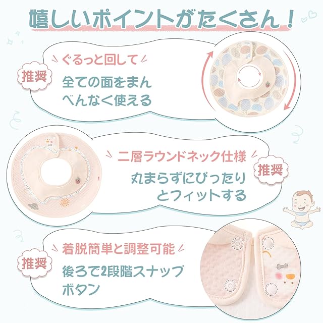 【取り外し簡単】お首回りにそっと掛け、背面のスナップボタンを留めるだけで着脱スムーズ。寝ちゃったお子様からの着脱、首の座ってないお子様にも便利です。二つ段階調節なボタン、赤ちゃんの成長に合わせて長く使えます。留めやすいうえに、しっかり固定できるのが魅力!よだれが多い時期には、間食時間や外出するときにも大活躍します。