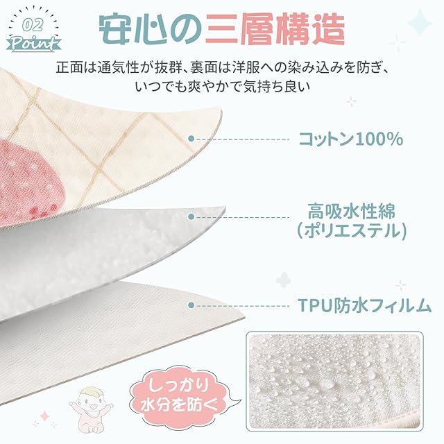 【裏地防水仕様】3層構造で仕上げたベビースタイです。スタイの中間には高吸水性綿が入っており、吸収力があり、通気性も優れているので赤ちゃんのよだれをすばやく吸収・発散します。裏面には防水フィルムを使用しているので、お洋服によだれが染み込む心配ありません。ベビーにもママにも嬉しいスタイです。