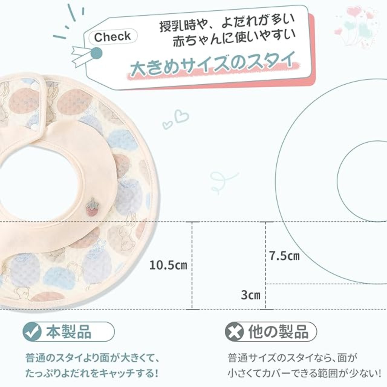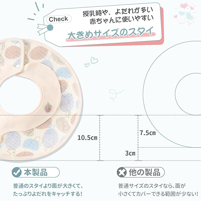 【天然素材使用】大きめサイズのスタイが新登場!広くて大きめの幅で、赤ちゃんのよだれをしっかりキャッチ!赤ちゃんが舐めたり噛んだりする可能性を考えて、蛍光剤やホルムアルデヒド等の有害な化学物質は一切利用しません。表地は100%綿素材で、肌にも環境にもやさしい、赤ちゃんの口に触れても安心・安全なスタイです。