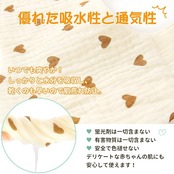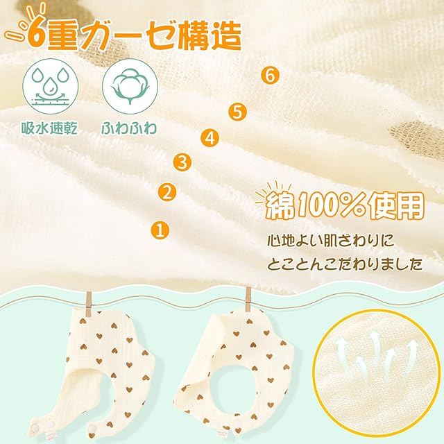 【通気性・吸水性抜群】6重ガーゼのやさしい手触りが魅力で、吸水性・通気性にも優れているため、ベビーに食べながら爽やかで清潔に保つことができます。ガーゼ素材ならではの高い速乾性で、洗ったあとすぐに乾かせるので便利です。