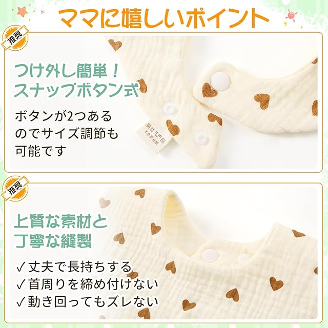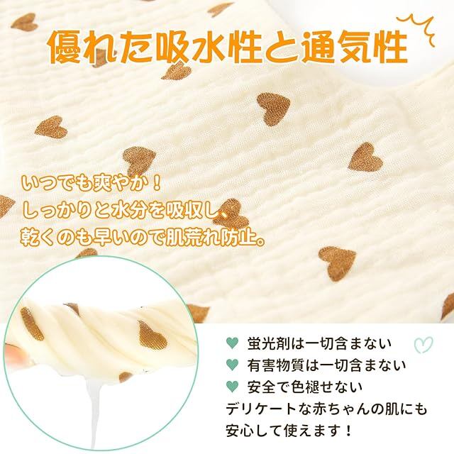 【100%綿素材使用】綿100%で肌にやさしいよだれかけです。赤ちゃんが舐めたり噛んだりする可能性を考えて、蛍光剤やホルムアルデヒド等の有害な化学物質は一切使用していません。敏感肌の赤ちゃんにも安心して使用できます。