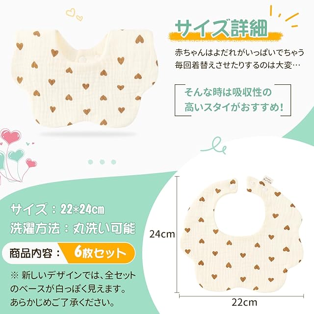 【商品特性】 <br> ・ 綿100%ガーゼ、柔らかくお肌に優しい気持ちいい。<br> ・上質なコットン採用で赤ちゃんのお肌を優しく守ります。<br> ・可愛いフラワー型、スナップボタンで着脱も簡単です。<br> ・6重構造の高品質ガーゼ、通気性も吸水性も優れております。<br><br> 【適用場合】<br> ① 食事・授乳・外遊び・よだれが出る・ミルクの吐き戻し対策 <br> ② 使い終わった後、しっかりと洗浄し風通しのよい場所で干してください<br><br> 【注意】<br> ※ 湿気を含んだ状態や水を含んだまま放置しないでください。 <br> ※洗濯の際は他の物と区別して、漂白剤を避け、手洗いをお勧めします。 <br> <br> 【商品説明】 <br> ・ セット内容:6×花びら型スタイ <br> ・素材:綿100%の6重ガーゼ<br> ・サイズ:22×24cm<br> ※ 本商品は平置きサイズで、採寸方法違いより、誤差がございますので、ご購入前にご了承いただけますようお願い申し上げます。<br>